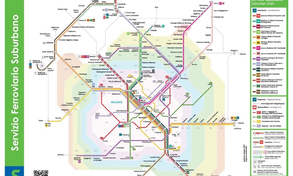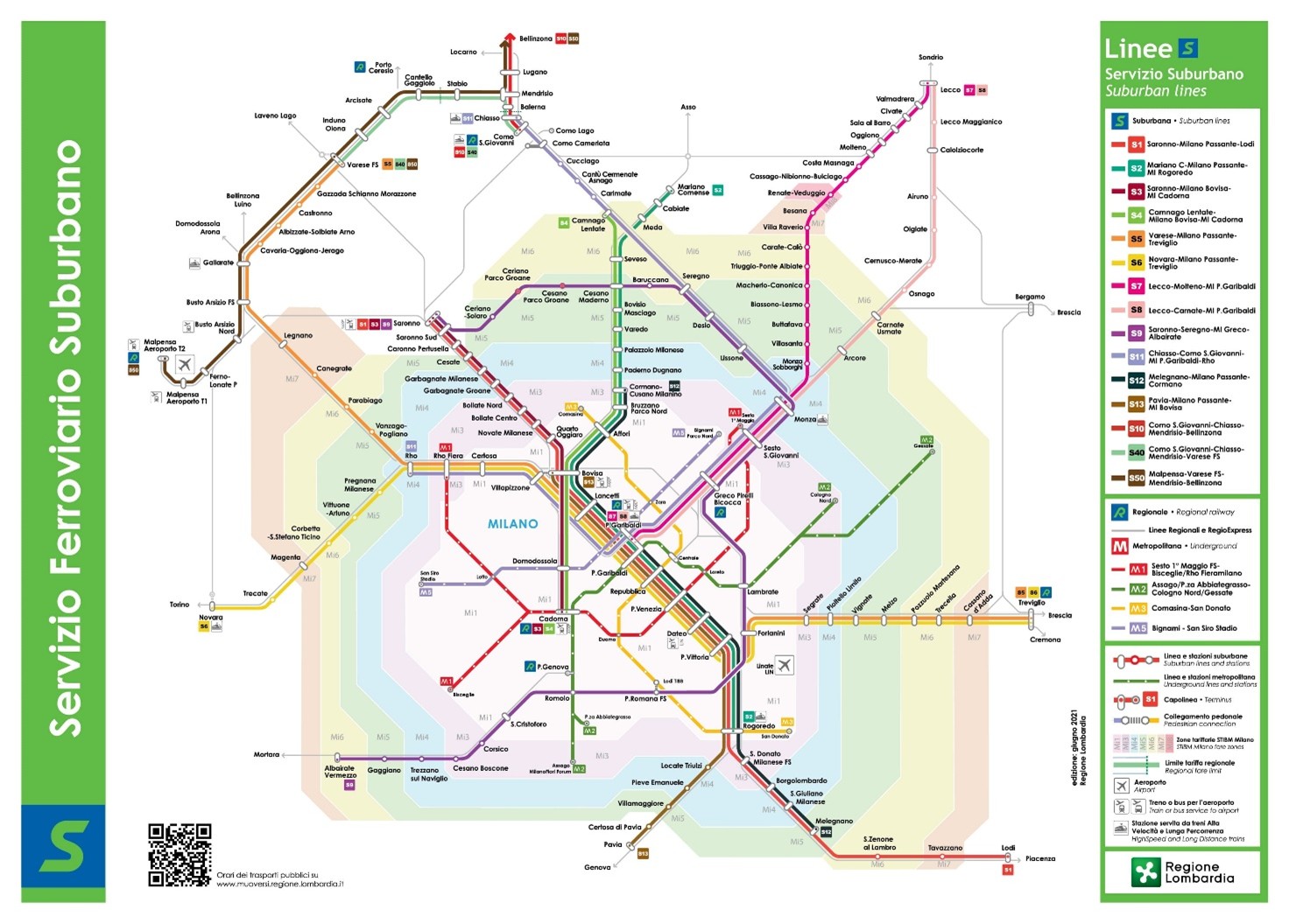 The Suburban Railway Service (“S”) – a service similar to the French RER and German S-Bahn – is one of Milano’s most recent infrastructures with its 12 suburban lines and over 130 stations, crossing the city in several directions and allowing easy transfer from suburban trains to all the urban public transport lines for commuters and tourists alike. This service is an underground railway and functions essentially like a subway line, and is marked as such on subway maps